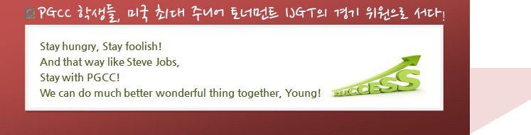 경기위원으로 활동하지 않은 PGCC 학생들은 등록 데스크에서 선수 한 명 한 명 에게 따뜻한 격려의 인사를 하는 등 참가자 관련 서비스를 했습니다. 골프 컬리지의 학생들이 자원 봉사 스텝 단체를 구성하는 것은 놀랄 일이 아닙니다. IJGT의 Director는 클린트 탈마지에서 열린 IJGT 이후에 사우스 캐롤라이나의 명문 골프 대학인 PGCC의 학생 취업 처장인 Jim Hoff로 부터 확실한 제안을 받았습니다.